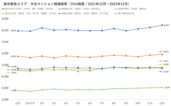 ・首都圏で推定価格がトップのエリアは「都心5区(千代田区・中央区・港区・新宿区・渋谷区)」で、2022年12月の推定価格は8,947万円。