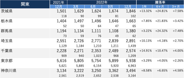 ・3ヶ月前との比較で、騰落率トップの都県は「神奈川県」で、+4.58%。