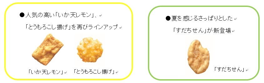 お馴染みの「ピー揚げ」をはじめ、レモンの酸味がおいしいサクサクとした「いか天レモン」、とうもろこしの甘みが口に広がる「とうもろこし揚げ」、すだちの酸味がクセになる「すだちせん」、さわやかな酸味が広がる「塩うめ豆」、黒こしょうがふわっと香る「黒こしょう豆」、パリッとおいしい風味豊かな「枝豆スナック」、ピリッとわさびの辛味をきかせた風味豊かな「焼海老スナックわさび風味」と、バラエティ豊かな8種のラインアップです。