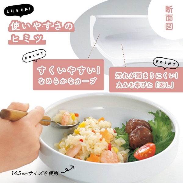 この食器は、内側に返しのあることですくいやすく設計されているため、子どもの「自分で食べたい!」という気持ちを応援してくれます。