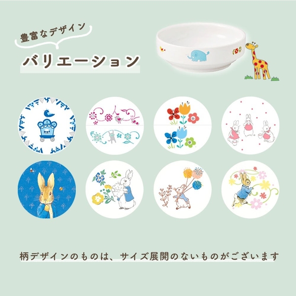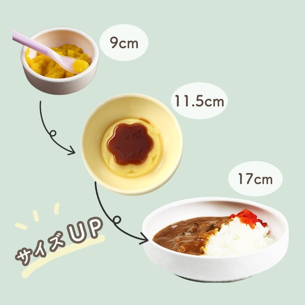 離乳食や果物に便利な9㎝、副菜やおやつ皿に使える11.5㎝、メインのおかずに使える12.5㎝、カレー皿にもちょうどいい14.5㎝、ワンプレートのお皿としても使える17㎝から選べます。