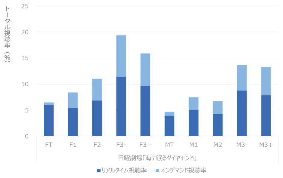 個人視聴率1位の「海に眠るダイヤモンド」は幅広い性年代のリアルタイム視聴、オンデマンド視聴共に人気でした。