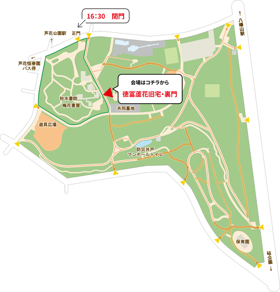 ※16:30以降は、恒春園区域(サービスセンター・蘆花記念館・徳冨蘆花旧宅・愛子夫人居宅を含む)の正門が閉じるため、「徳冨蘆花旧宅前の裏門」からお入りください。