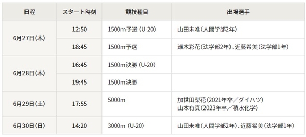 今大会は、8月に開催される「パリ2024オリンピック競技大会」の最終選考会を兼ねており、女子5000mには卒業生の加世田梨花選手(2021年法学部卒・現ダイハツ)と山本有真選手(2023年人間学部卒・現積水化学)も出場予定。U20は「リマ2024世界選手権」の代表選考会を兼ねており、いずれも世界に向けた挑戦になります。