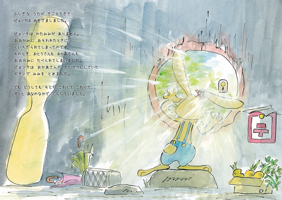 裁縫が得意だったお母さんのボタンをみみにつけると、ピョンタはひとりでもがんばれる気持ちになる。