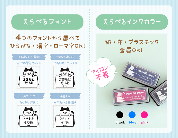 学参・旧字に対応した「丸ゴシック」からかわいい「手書き風」まで、全4種類のフォントから選ぶことができます。また、ひらがなだけではなく漢字やローマ字にも対応。付属のインクカラーも3色ご用意しておりますので、洗濯タグで目立つよう「ブルー」や「ピンク」のセレクトもオススメです。