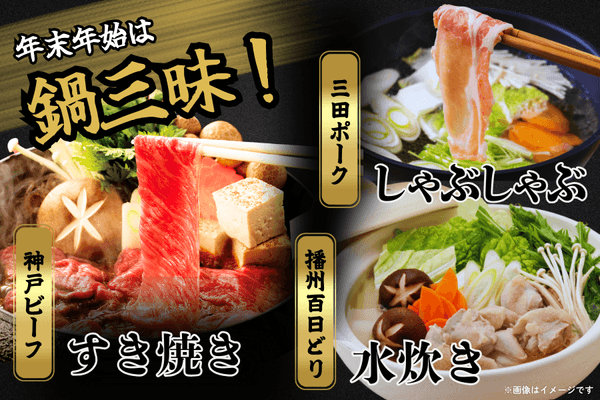 兵庫のブランド肉ですき焼き・水炊き・しゃぶしゃぶの鍋三昧の年末年始を。