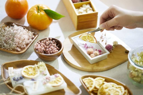 精油とドライした果実を使い、自分好みで飾り付けをして、アロマワックスバー(*)を作ります。見た目の可愛らしさはもちろん、いつでもだいだいの香りを楽しめるアイテムです。完成品は旅の思い出として、自宅に持ち帰ることができます。