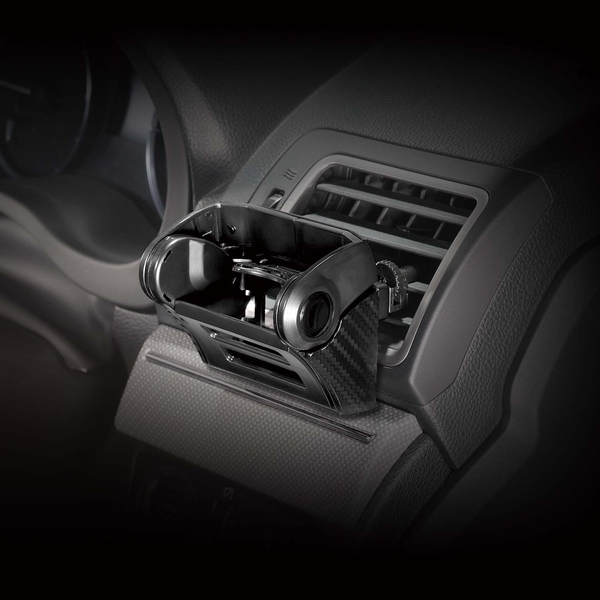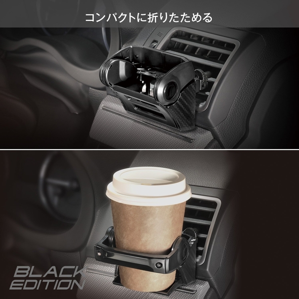ワンプッシュでアームがゆっくり開く機構が人気のダンパー内蔵ドリンクホルダーに、ブラックエディションモデルが登場。ブラック&カーボン柄で落ち着いた内装と好相性