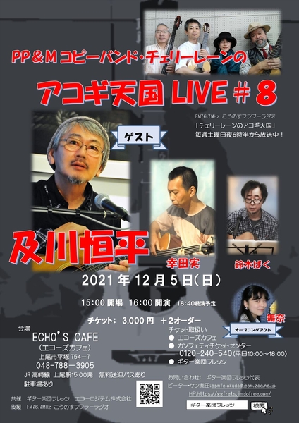 「チェリーレーンのアコギ天国LIVE」では、PP&Mコピーバンドのチェリーレーンが毎回ゲストを迎え、埼玉県上尾市のエコーズカフェでドリンク・お食事も楽しめるライヴを開催します。