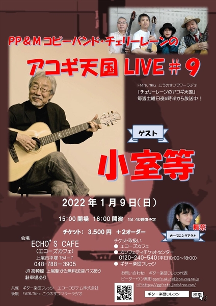 ピーター・ポール&マリーのコピーバンドとして活躍中のチェリーレーンによる「チェリーレーンのアコギ天国LIVE」が2021年11月14日 (日)・2021年12月5日 (日)・2022年1月9日 (日)にエコーズカフェ(埼玉県上尾市)にて開催されます。フォーク界のレジェンド、六文銭のメンバーが毎回ゲストとして出演します。オープニングアクトに舞奈(18)も出演予定。チケットはカンフェティ(運営:ロングランプランニング株式会社、東京都新宿区、代表取締役:榑松 ⼤剛)にて。カンフェティ限定割引チケット発売中です。