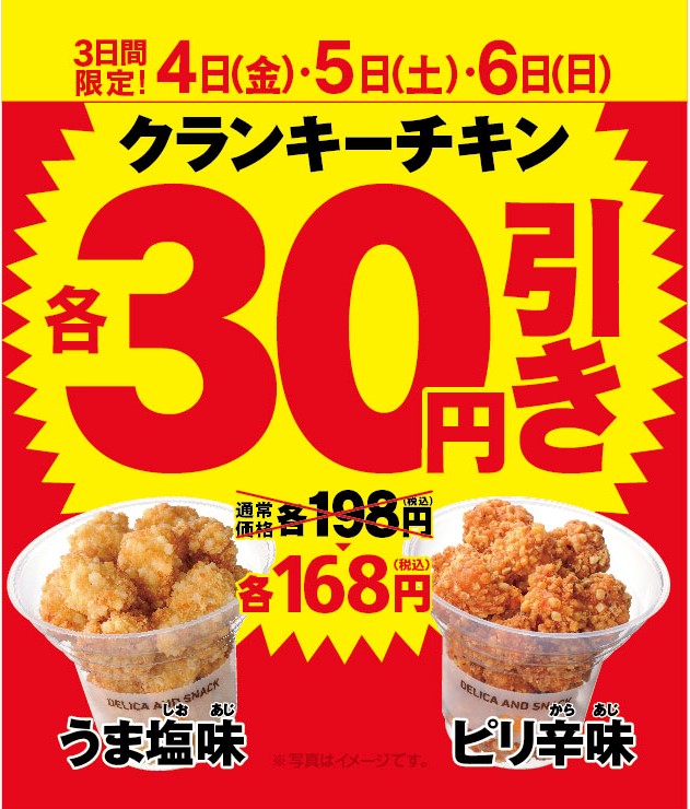 3月4日(金)・5日(土)・6日(日)の3日間限定! 人気のクランキーチキン2品30円引きセール実施!