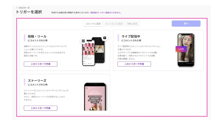 エルグラムの自動応答機能とは、インスタグラムユーザーからのさまざまな反応に対して、自動で返信ができる機能です。