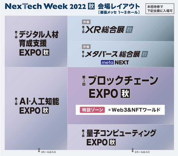 また、今回開催される「第3回 ブロックチェーン EXPO【秋】」では、話題沸騰中の「Web3(ブロックチェーン技術により実現する非中央集権型のインターネット)」や「NFT(非代替性トークン)」に関連した技術やマーケットプレイスが出展する「Web3 & NFTワールド」を特設。デジタルアート、ゲーム、スポーツ、その他、メタバース等を始めとした「NFT」と親和性の高い分野の企業による出展に加え、「NFT」技術の導入を検討する様々な業種の企業の訪問を対象としています。