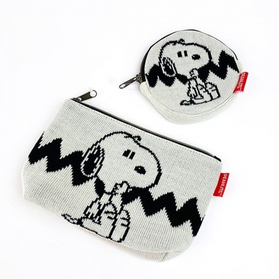 オフホワイトのニット素材のポーチです。中央にお座りポーズのスヌーピーにキュンキュンしますね♡