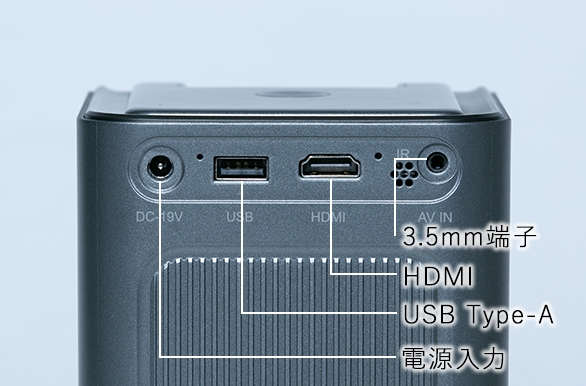 背面はHDMI他、イヤホンジャックにも対応。USBを使ってプロジェクター本体にファイルを読み込むことも可能です。