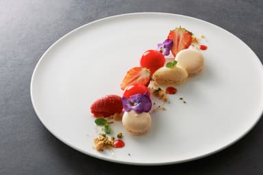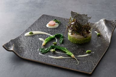 千葉が作るコンテンポラリー・フレンチは“素材そのものを活かした滋味深い味わい”が特徴です。前菜では菜の花やホワイトアスパラガス、魚料理ではオマール海老の濃厚なソースで仕上げた上質な金目鯛などの食材で日本の旬を表現。また“料理の味わいを想像する事も楽しんでもらう”という千葉のコンセプトにより料理名をシンプルに。そして美しいプレゼンテーションに仕上げています。