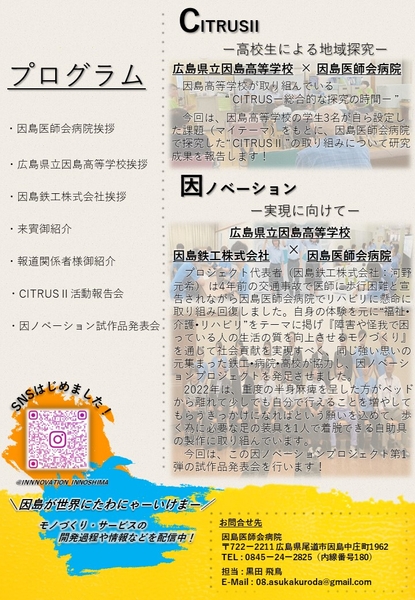 広島県尾道市の人口2万人ほどの島「因島」にある因島鉄工株式会社、因島医師会病院、因島高校の3者は共同して日常生活動作にお困りの患者様の生活の質を向上させるモノやサービスを発案し、2023年3月に成果物をお披露目いたします。