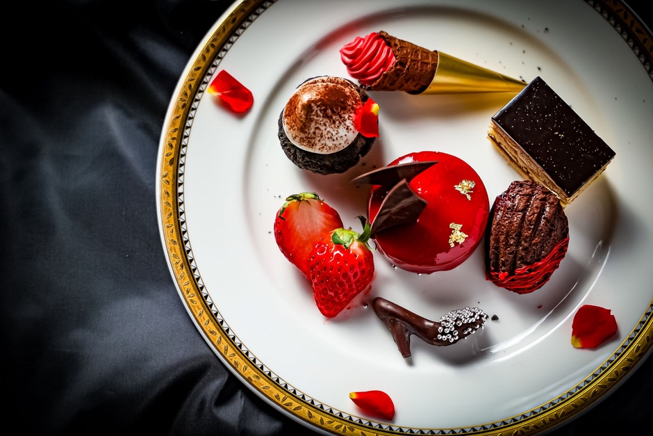 オプションの『ハートのルージュストロベリーケーキ』は、レッドベルベットケーキと呼ばれている真っ赤なハート型のスポンジケーキをご用意。ココアやフランボワーズ、ビーツを使用し、上部にはフレッシュいちごや薔薇、ハイヒールチョコ、ティアラを飾ることで、大人かわいい一皿に。心斎橋セントグレースヴィラで、友人と家族と恋人と、心ときめくひとときをお過ごしください。
