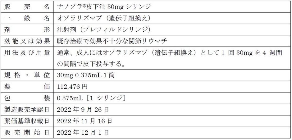 大正製薬株式会社[本社:東京都豊島区 社長:上原 茂](以下、当社)は、TNFα阻害薬「ナノゾラ®皮下注30mgシリンジ(一般名:オゾラリズマブ(遺伝子組み換え))」(以下、「ナノゾラ®」)が本年11月16日に薬価基準に収載され、本日発売の運びとなりましたのでお知らせいたします。