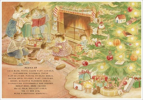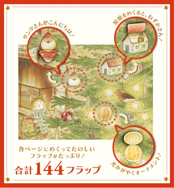 とびきりのクリスマスをむかえるために、ねこさんのかぞくが張りきって準備する様子が、クリスマスの12日前から当日までカウントダウンしながら1日1見開きで描かれています。各日の見開きページにはそれぞれ12のフラップがあり、散りばめられたフラップをみつけてあける楽しみと、フラップの下からあらわれた絵をみるわくわくが詰まった一冊です。