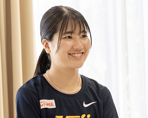 岡藤選手が中学3年生の頃、当時大学1年生だった谷本選手と全国都道府県対抗女子駅伝の広島チームにて出会い、薫陶を受けて名城大進学を心に決めていた。小学6年生の頃にクラブチームで陸上を始め、それ以来陸上に打ち込んでいる。高校1年時に800mと1500mでインターハイ出場の実績を持ち、大学でも1500mを専門として取り組んでいくつもりだ。出場したい大会を尋ねられると「それはもう駅伝です」ときっぱり。「1年目はチャレンジの年として、先輩方を少しでも助ける走りをしたい」と話す。