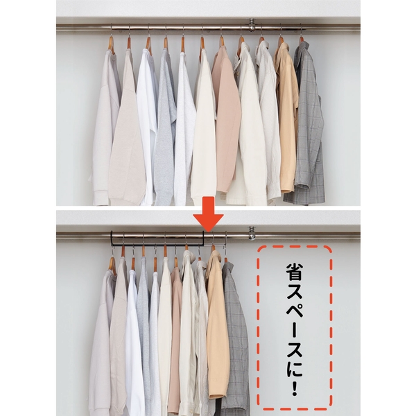 本製品と既設のハンガーパイプに交互に服を掛けることにより、収納量がアップします。