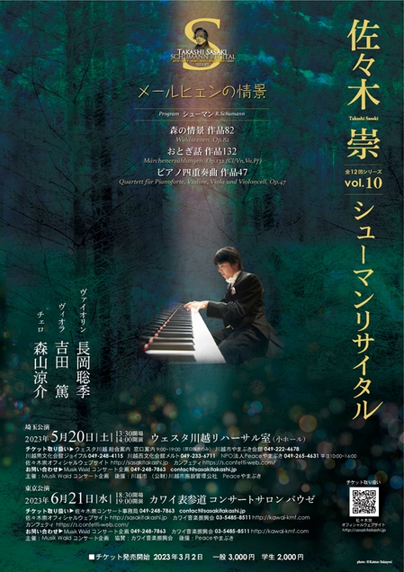 Musik Waldコンサート企画主催、佐々木崇シューマンリサイタルVol.10(全12回)『メールヒェンの情景』が埼玉、東京の二会場にて開催されます。