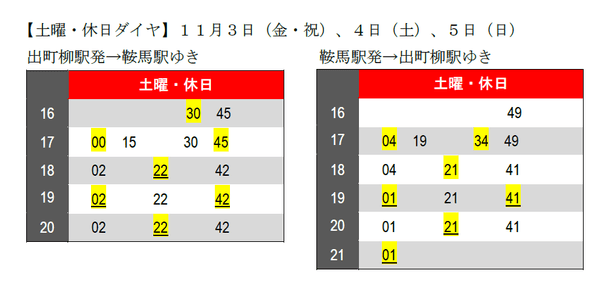 【土曜・休日ダイヤ】11月3日(金・祝)、4日(土)、5日(日)