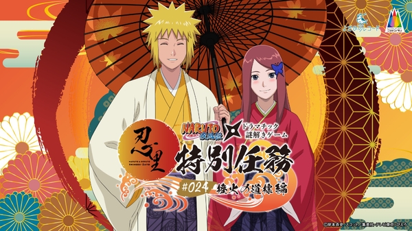 『NARUTO-ナルト-』のキャラクターたちのオリジナルストーリーを体験しながら、謎解きゲームに挑戦する特別イベントの第24弾。今回の特別任務は『NARUTO-ナルト-』の世界をベースに、アニメでもほとんど描かれることのなかった、ミナト・クシナ夫婦の日常が織りなすオリジナルストーリーを体験できます。夫婦の物語を追体験しながら、広大な自然の地形を活かした謎解きゲームをお楽しみいただけます。任務に参加された方には、全2種のオリジナルアクリルキーホルダーから1つをランダムにプレゼントいたします。