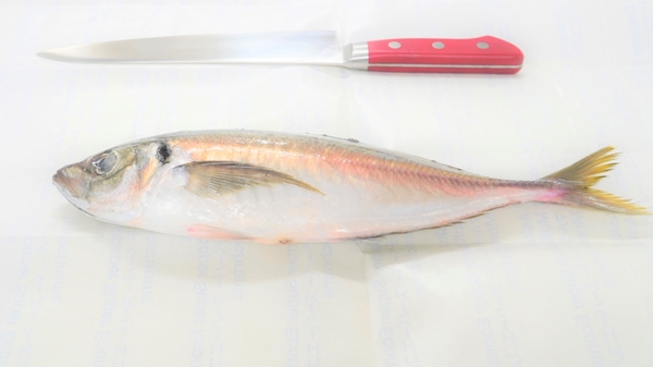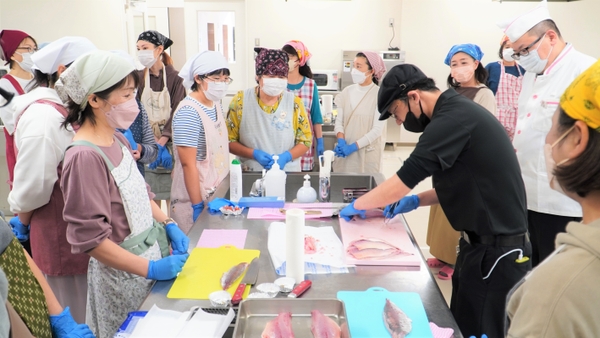 今回、参加者のみなさんがさばいた魚は写真のとおり見事な大きさのアジで、プロの指導のもと一人二尾ずつ三枚おろしに挑戦されていました。出来上がった料理はどれもおいしく、参加者のみなさんはとても満足されていました。