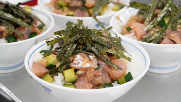 内容:お魚のさばき方の実演、あじの梅薬味丼、あじのトマトチーズ焼き、