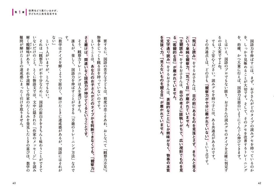 一流難関校、国立医学部合格者を次々に輩出する新しい国語学習法が1冊に! 国語が苦手な子に足りないのは「観察力」だった。3タイプの「読みグセ」に合わせた観察力トレーニングで、偏差値を20アップする子も!