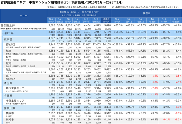 「不動産×WEB×ビッグデータ」の領域で、さまざまな不動産テックサービスを展開する株式会社ワンノブアカインド(本社:東京都港区、代表取締役社長:川島 直也、以下当社)は、当社が運営しているマンション情報サイト「マンションレビュー」の保有データを元に、全国の2025年1月の中古マンション相場を調査。坪単価をベースに70㎡での価格に換算した「中古マンション価格」*1について、10年前・5年前・3年前・前年からの推移を都道府県別・エリアごとにまとめましたので、発表いたします。