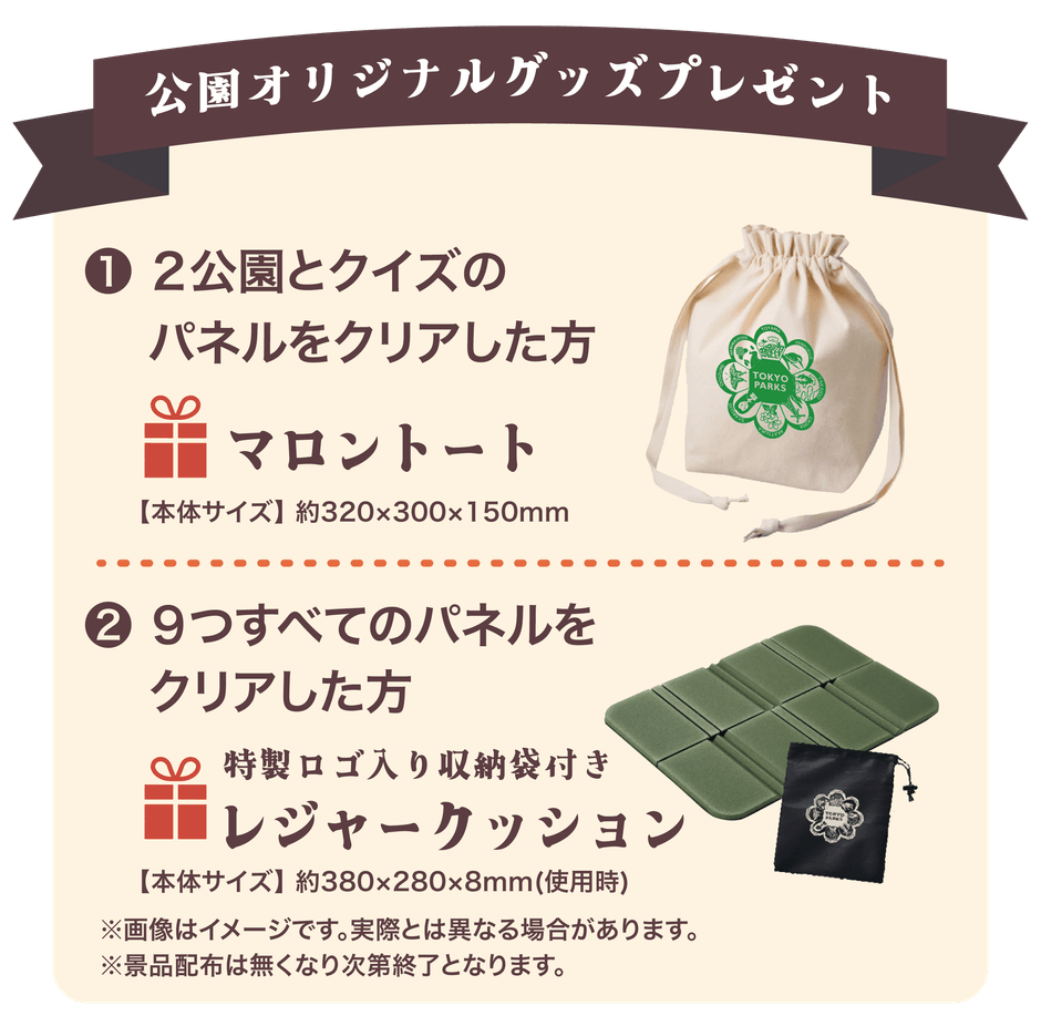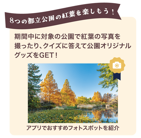 木々が色めく紅葉シーズンの期間中に、対象の公園で紅葉の写真を撮って、クイズに答えて公園オリジナルグッズをGETしよう!(※景品の配布は無くなり次第終了となります)