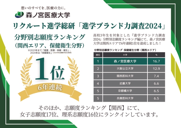 森ノ宮医療大学(学長 青木元邦、大阪市住之江区)は、11月8日リクルート進学総研が発表した「進学ブランド力調査2024~イメージ項目別ランキング、分野別志願度ランキング編~」において、分野別志願度ランキング※で、関西エリア6年連続第1位となりました。多くの高校生の皆さんに魅力的だと感じていただけていることを嬉しく思うと同時に、今後さらに「受験したい、進学したい」と思っていただける大学づくりを続けて参ります。