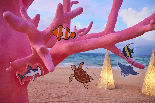 ホテルに隣接するビーチに、今年もサンゴをモチーフにしたクリスマスツリーが登場します。サンゴに見立ててピンクに色づいたツリーの大きさは全長約6メートル。今年はツリーに小浜島の近海に生息する海の生き物を模した装飾を配し、周囲にはサンゴと白砂で作られたツリーが並びます。夜になるとライトアップされたツリーや装飾が、小浜島ならではのクリスマスを演出します。