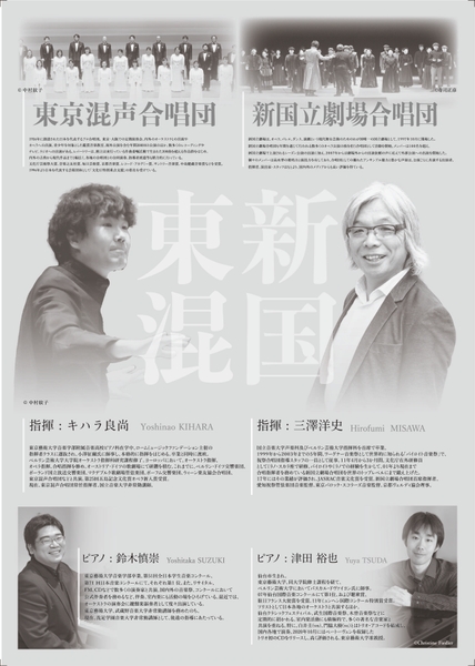 日本を代表するプロ合唱団である東京混声合唱団と、新国立劇場のオペラ公演をはじめ数々の舞台でその歌声を響かせる新国立劇場合唱団との合同コンサート。