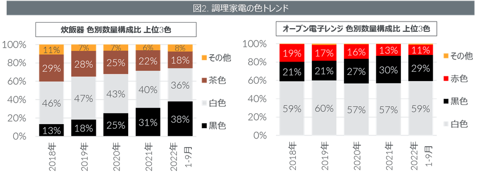 ・炊飯器市場ではここ数年で黒色が伸長し、22年1-9月期では過去主流だった白色を上回る規模に拡大