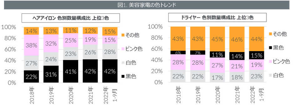 ヘアアイロン市場では、黒色の数量構成比が18年の22%から22年1-9月には42%にまで拡大した。18年時点ではピンク色の構成比が38%を占め、2位の白色に10%ポイント以上の差をつけ1位だった。しかし年々構成比を減らし、22年1-9月においては15%にまで縮小した。ドライヤー市場においても、黒色の構成比は18年の6%から22年1-9月には15%に拡大した。対照的にピンク色の構成比は縮小し、18年の28%から22年1-9月には19%となった。
