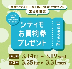 京阪シティモールLINE公式アカウント友だち限定で、当日のお支払い合計5,500円(税込)ごとに、500円分のシティモお買物券を1枚プレゼント。