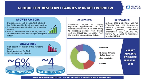 世界の耐火性ファブリック市場の成長は、2022年から2031年の間に消防士と石油・ガス産業における耐火性ファブリックの使用を約6%のCAGRで増加させることによって推進される