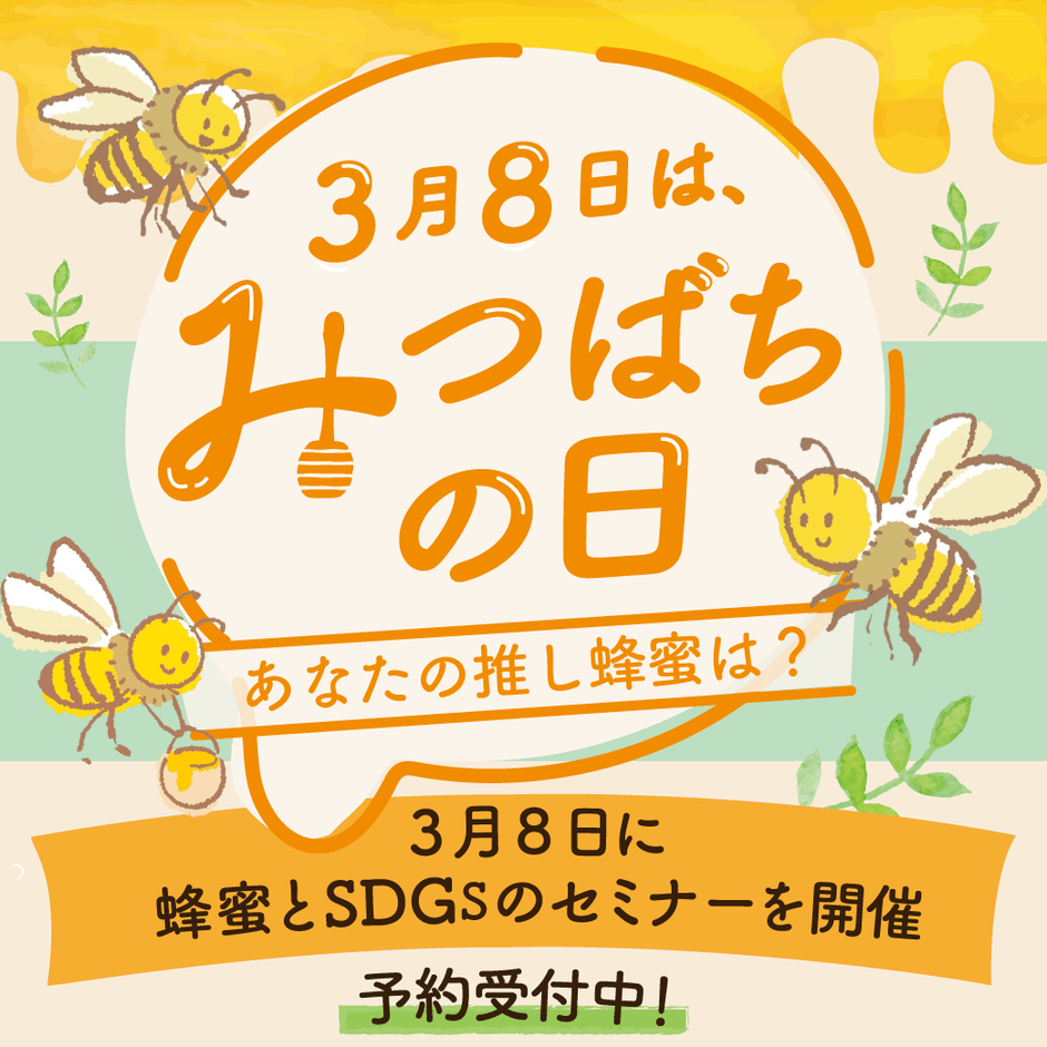 3月8日は「みつ(3)ばち(8)の日」。 全日本はちみつ協同組合と日本養蜂はちみつ協会(現:一般社団法人日本養蜂協会)が制定しました。ミツバチは、花の蜜を巣に蓄え蜂蜜を作ったり、作物の受粉にも用いられ、私たちの生活とも密接に関わっています。ミツバチが減少してしまうと人類は食糧問題の危機に直面してしまうと言われています。蜂蜜は、ミツバチやミツバチが花を訪れて蜜を採る蜜源植物などの自然が守られてこそ、食べることのできる食品です。3月8日の「みつばちの日」には、ミツバチと私たちを取り巻く世界について思いを馳せてみるのもよいかもしれません。
