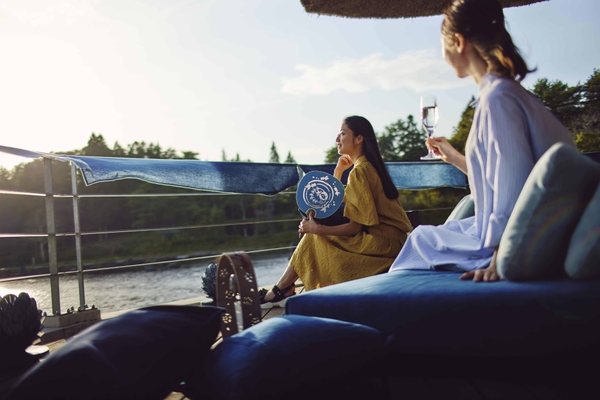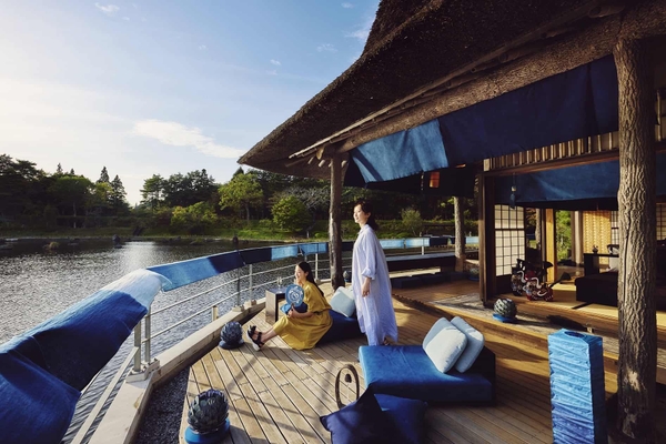 青森の文化を目一杯満喫できる宿「星野リゾート 青森屋」では2022年6月1日~8月31日の期間、藍色に染まるテラスで涼むプログラム「あおもり藍涼み」を実施します。青森の伝統技法を用いた、藍色を基調とした調度品で設えた涼しげな空間で、眼前に広がる公園の景色を眺めながら、金魚が悠々と泳ぐ様子をイメージしたスイーツを味わって、涼むことができます。