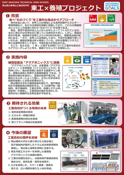 工業高校生が分野の垣根を越えて、付加価値の高い水産養殖と植物の栽培を同時に行う、循環型農法「アクアポニックス」に挑戦することになりました。設備の温度調節やポンプなどの電力は太陽光エネルギーでまかない、実習で培った化学分析の技術を駆使して水質を管理。さらに、岡山理科大学と連携し、体験学習を通じて養殖技術を学びながら、3年生の課題研究を中心に5科(機械科、電気科、電子機械科、工業化学科、設備システム科)が連携して研究に取り組みます。