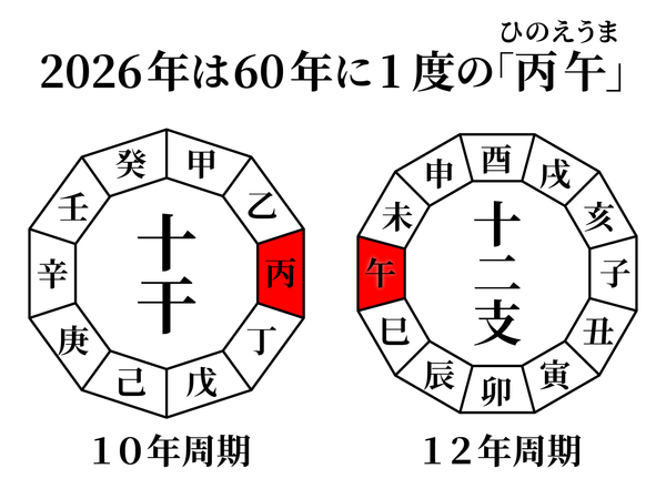 来年の十干十二支は60年に一度の「丙午(ひのえうま)」の年回りとなります。昔は「丙午の年は火災が多い」「丙午生まれの女は気性が激しい」などと言われ忌み嫌われましたが、これは江戸時代の暦占いから生まれた迷信です。