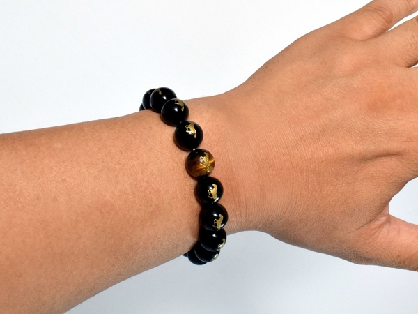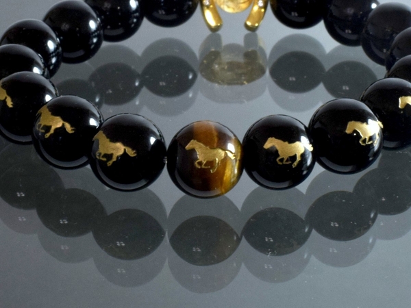 さらに『三合火局馬九行駆ブレスレット』には天然石の虎目石と黄水晶をあしらいました。東洋占いの算命学では十二支にはそれぞれ相性が良い「三合会局」の組み合わせがあるとされ、虎目石は「寅」、11月の誕生石の黄水晶は「戌」を象徴し、「三合火局」を形成しています。算命学では「三合会局」は運気が上昇する「旺気」を作るとされ大変縁起の良い組み合わせです。新年の開運招福を祈願するのにふさわしいブレスレットに仕立てています。