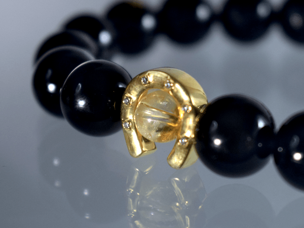『三合火局馬九行駆ブレスレット』は日本の宝石の街・山梨県甲府市のメーカーが制作した国産品です。馬の彫刻にはハンドメイドで丁寧に黄金色のエナメル塗装を施し、漆黒のブラックオニクスの12mm玉と、地金にシルバーを用い18金メッキを施した金色の馬蹄は、メンズのアクセサリーとしての存在感と満足感を与えてくれます。