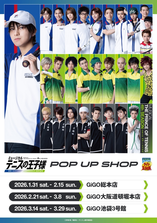 株式会社GENDA GiGO Entertainment(本社:東京都港区 代表取締役社長:二宮 一浩、以下「当社」)は、中外鉱業株式会社(本社:東京都千代田区 代表取締役社長:西元 丈夫)の全面協力のもと、GiGOグループのお店において、2026年1月31日(土)より、週刊少年ジャンプにて連載された許斐 剛による少年漫画『テニスの王子様』を舞台化した、ミュージカル『テニスの王子様』4thシーズン 青学(せいがく)vs四天宝寺POP UP SHOPを開催いたします。
