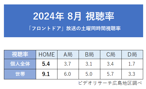 広島ホームテレビ(本社:広島市中区)で毎週土曜ごご1時から放送、ひろしま深掘りライブ「フロントドア」は、2024年度8月の月間平均視聴率で個人全体・世帯いずれも5カ月連続同時間帯1位(ビデオリサーチ調べ、広島地区)を記録しました。